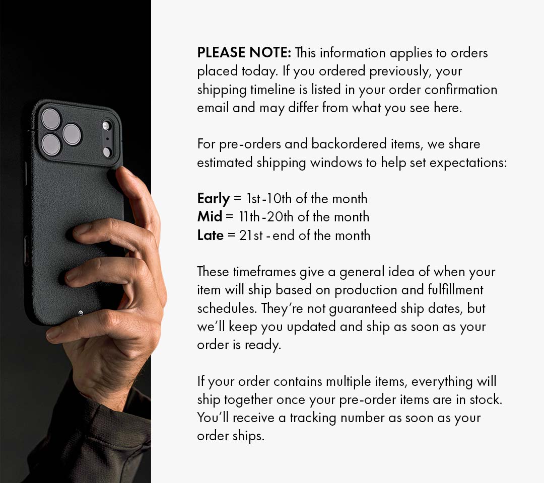 | MATERIAL | Proprietary ShockLite™ perimeter and a robust, textured polycarbonate back shell | Proprietary ShockLite™ and polycarbonate blend with a premium microfiber lining | |